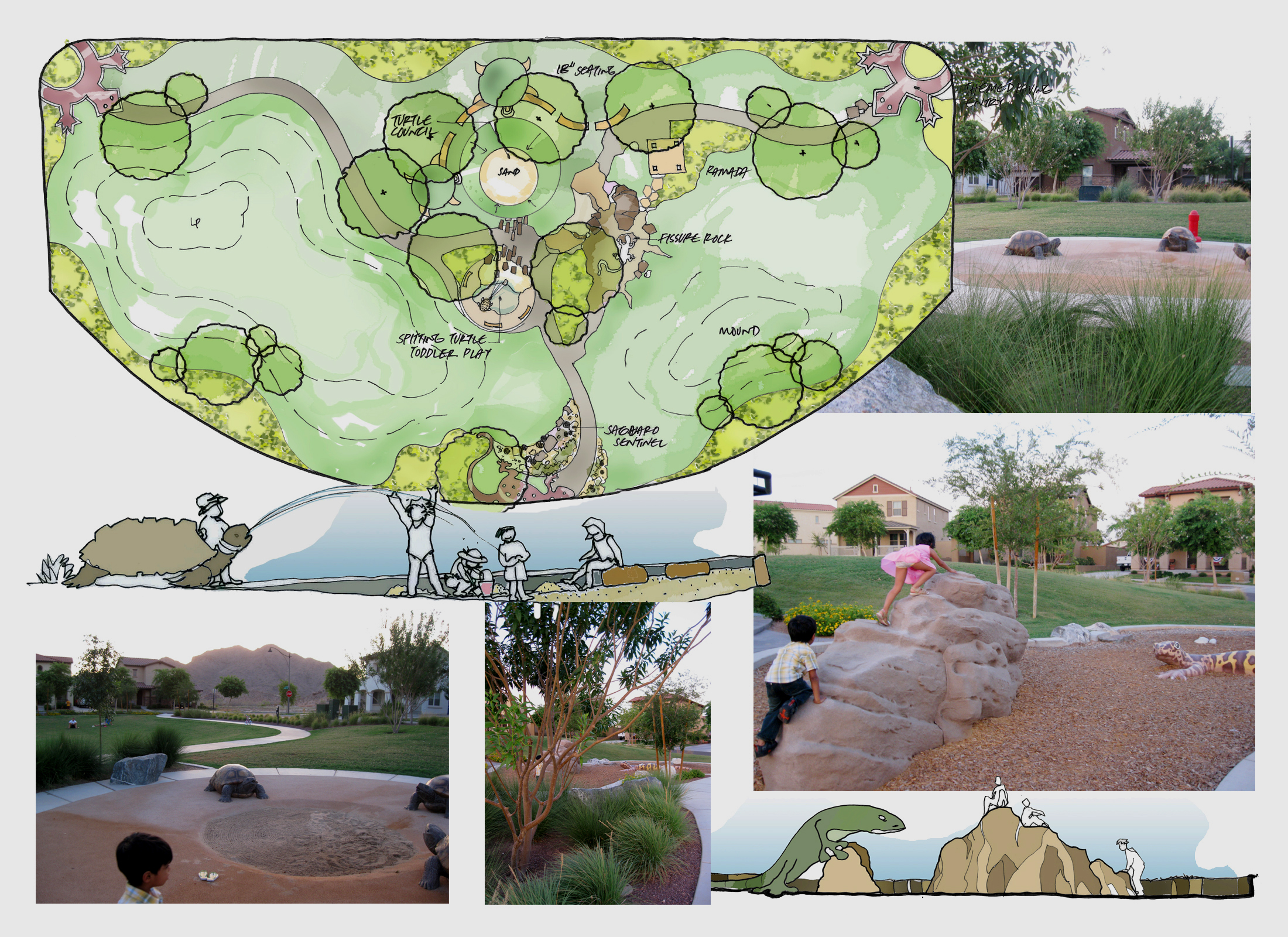 Picking up on the clients requirement for a playful theme, a ‘critter park’ composed of reptilian themed play areas strung together by an interesting interplay of turf mounds and depressions. Rock climbing, water play and kid friendly adventure is all rolled into the theme of the park. Project designed while at EDAW, Phoenix.